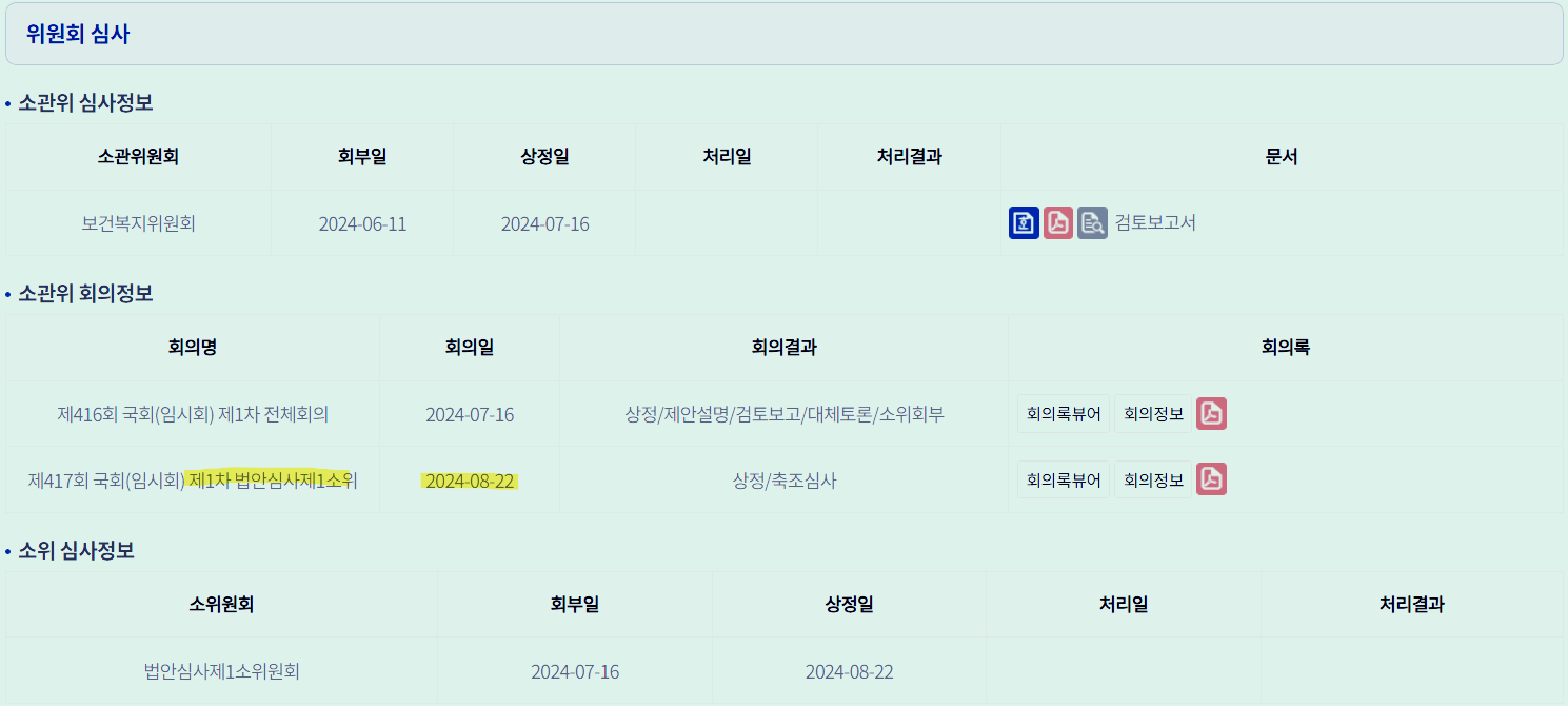 이 법안을 가장 먼저 발의한 의원은 이수진, 김선민 의원인데 발의일자가 2024년 6월 3일이다. 그런데 이 법안은 2024년 8월 22일에 복지위 법안소위에 상정된 후 논의가 멈춰있다. 1년 반 정도 방치되고 있는 상황에서 유사한 법안들만 계속 발의되고 있는 중이다. 간병파산, 간병살인이라는 말이 나올정도의 심각성에 공감한다면 발의 의원들이 앞장서서 심사를 서들러야 하지 않을까?