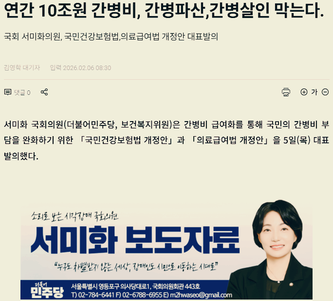 이 법안을 가장 먼저 발의한 의원은 이수진, 김선민 의원인데 발의일자가 2024년 6월 3일이다. 그런데 이 법안은 2024년 8월 22일에 복지위 법안소위에 상정된 후 논의가 멈춰있다. 1년 반 정도 방치되고 있는 상황에서 유사한 법안들만 계속 발의되고 있는 중이다. 간병파산, 간병살인이라는 말이 나올정도의 심각성에 공감한다면 발의 의원들이 앞장서서 심사를 서들러야 하지 않을까?