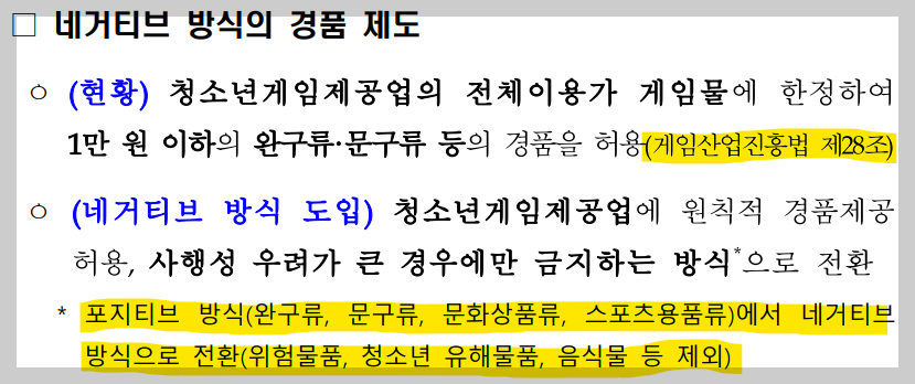 정부가 발표한 게임산업 진흥 종합계획에 따르면 게임물 경품 규제를 현재의 '포지티브' 방식에서 '네거티브' 방식으로 전환하겠다는 내용이 포함되어 있다.