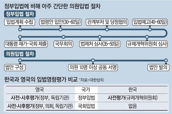 참고로 이런 방식의 국회의원 법안 발의를 '청부입법'으로 본다. 정부가 기획하고 입안한 법안이지만, 법안을 정부가 내는 것이 아니라 국회의원을 통해서 내는 방식이다. 정부 입장에서는 자기들이 법안을 제출하려면 시간이 너무 많이 걸린다. 법안을 입안한 뒤에 관계기관 협의, 입법예고, 규제심사, 차관회의, 국무회의 등 거쳐야 할 절차가 첩첩산중이다. 보통 이 절차만 거치는데도 6개월 이상 걸린다. 특히 규제심사를 통과하기가 쉽지 않다. 반면, 국회의원이 법안을 발의하는 절차는 간단하고 빠르다. 10명 이상의 공동발의 또는 찬성의원 서명만 받으면 즉시 발의할 수 있다. 정부 입장에서는 국회의원을 경유하면 온갖 귀찮은 절차를 생략하고 빠르게 법안을 낼 수 있다.