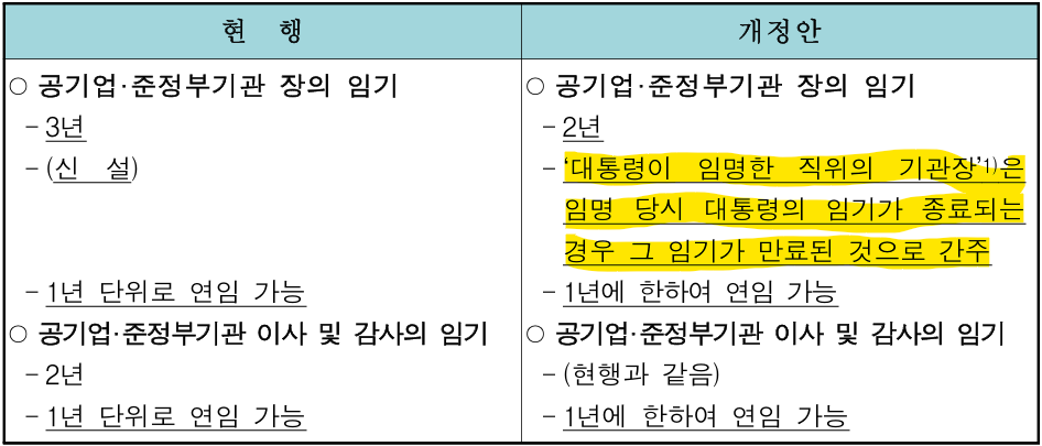 또한 현행 3년의 기관장 임기를 2년으로 하고, 1년에 한하여 연임할 수 있도록 했는데 이렇게 하면 대통령 임기 마지막에 임명된 기관장은 어차피 임기를 채우지 못하기 때문에 현직 기관장의 법적 임기가 최대한 보장될 수 있다.