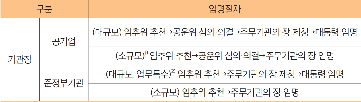 「공공기관의 운영에 관한 법률」 제25조(공기업 임원의 임면)에 근거하여 "공기업 장은 임원추천위원회가 복수로 추천하여 운영위원회의 심의·의결을 거친 사람 중에서 주무기관의 장의 제청으로 대통령이 임명한다." 다만, 소규모 기관의 경우 주무기관의 장이 임명한다. 공기업 비상임이사는 운영위원회의 심의·의결을 거쳐 기획재정부장관이 임명하고, 공기업 감사는 기획재정부장관의 제청으로 대통령이 임명한다.
