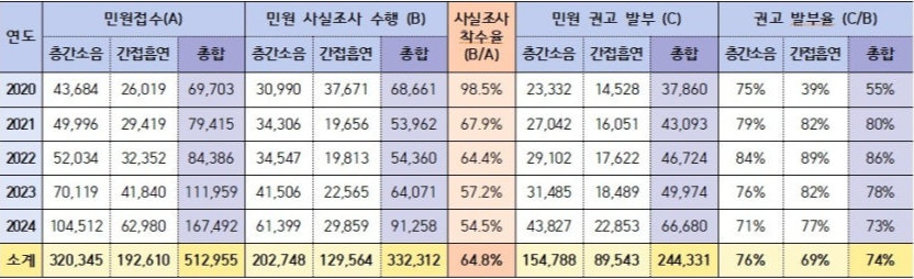 2020년부터 2024년까지 공동주택 내 간접흡연 관련 민원은 총 19만 2,610건에 이른다. 층간소음과 함께 대표적인 민원이다. 공동주택 관리자나 주민자치조직을 통해 세대 내 흡연 금지를 반복적으로 요청하고 있지만, 간접흡연으로 인한 피해와 분쟁이 줄지 않고 있다.