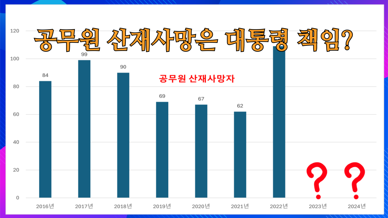 공무원 산재사망, 즉 공무원의 공무상 사망자는 얼마나 될까? 이런 저런 자료에 의하면 2018년에 90명, 19년에 69명, 20년에 67명, 21년에 62명, 22년에 109명이었던 것으로 확인된다. 2023년 이후 통계는 어디에도 나와있지 않다. 과거의 추이로만 보면 여전히 그 숫자가 상당할 것으로 보인다. 민간기업의 산재사망에 대해서 정부가 "미필적 고의살인"이라며 '철퇴'를 예고하고 있는데, 그럼 통계도 제대로 잡히고 있지 않은 공무원 산재사망은 누구의 책임인가? 공공기관장? 장관? 아니면 행정부의 수반인 대통령 책임일까? 이도 저도 아니면 그냥 본인의 책임일까?