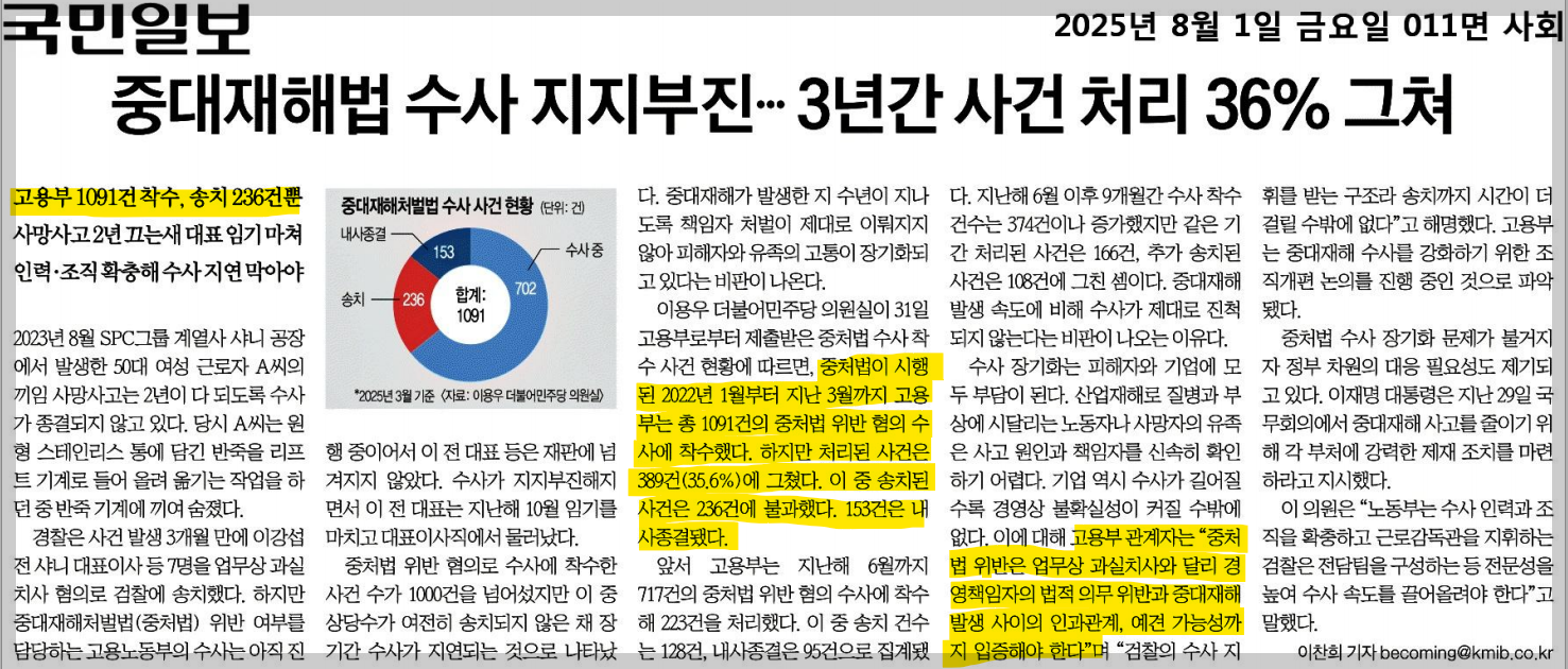 산업재해 관련 또 하나의 법률적 축은 중대재해처벌법이다. 현행 중대재해처벌법에서는 산업재해 예방을 위한 사업주와 경영책임자의 역할을 규정하고 있다. 이들에게 재해예방에 필요한 인력 및 예산 등 안전보건 관리체계의 구축 의무를 부과하고 있는데, 이를 위반해 중대산업재해가 발생하면 1년 이상의 징역 또는 10억원 이하의 벌금에 처한다.