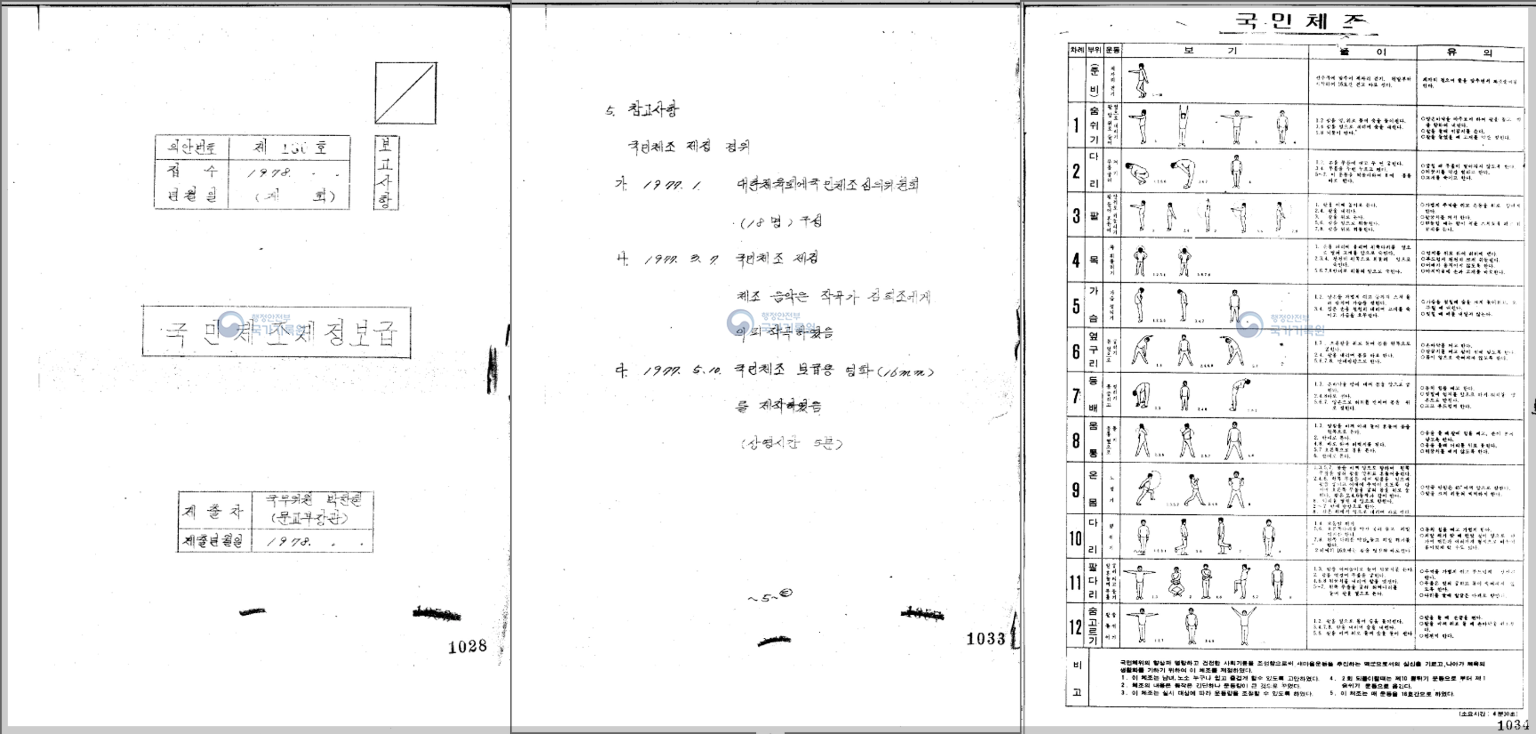 국가기록관 자료를 찾아보니 1978년 2월에 국민체조 제정 보급계획이 국무회의에 보고됐다. 국민체조는 음악과 구령에 맞추어서 하는 12개의 동작으로 구성되어 있는데 주로 군대식 동작이다. 국민체조는 이후 20년 이상 각급 기관과 학교를 중심으로 보급됐다. 그러나 이 체조가 전체주의적 군사문화로 인식되며 사실상 자취를 감추었다. 현재는 40대 중반 이상의 사람들에게 '라떼는 말이야...' 정도의 유물로 남아있다.