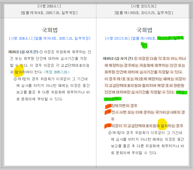 국회법 제85조의 심사기간 지정을 두고 하는 말이다. 보통 이 조항을 근거로 '국회의장 직권상정'을 이야기한다. 그런데 사실 이 조항은 국회의장의 직권상정을 열어준 조항이 아니라, 직권상정을 못하도록 막은 조항이다. 소위 '국회 선진화법'이라 부르는, 2012년 5.2일 본회의에서 통과된 「국회법」이다. 여기에서 의장이 직권상정할 수 있는 경우를 천재지변, 국가비상사태, 교섭단체 대표 합의사항만 가능하게 했다.(개정 이전에는 이런 제한이 없이 폭넓게 가능했다) 노란색 부분처럼 '협의'도 '합의'로 바꾸었는데, 국회에서 협의와 합의는 천지차이다. 합의는 말그대로 합의고, 협의는 그냥 말 한마디만 나눠도 협의다. 의장 직권상정으로 국회가 파행되는 일이 많다보니, 원천적으로 국회의장 직권상정을 금지한 조항이라고 보는게 맞다. 그런데 이걸 박지원이 모르고 하는 말이었을까?