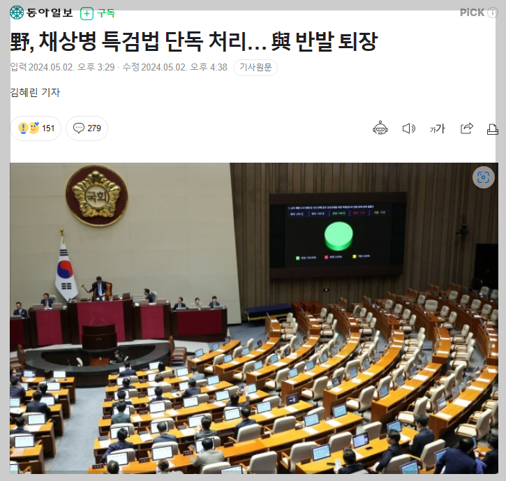 이런 상태에서 4.10일 총선이 있었고, 결과는 아다시피 야당 압승, 우여곡절 끝에 5월 임시국회에서 본회의는 5월 2일에 열기로 합의되었다. 그런데, 민주당 입장에서는 2일 본회의에 「채상병 특검법」을 상정해서 처리해야 하는데, 이게 또 간단치 않다. 여당과의 의사일정 합의는 100% 불가능하고, 앞서 설명한 것처럼 국회의장이 직권상정 하는 것도 국회법상 불가능하다. 이럴 때 동원하는 방법이 '의사일정 변경'이다.
