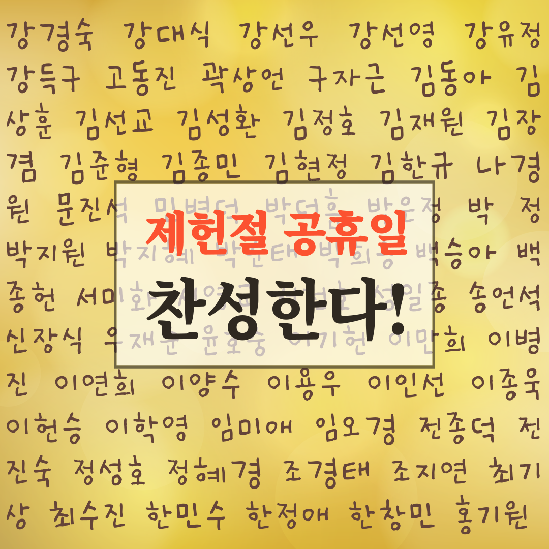 내일 모레 7월 17일은 제헌절이다. 제헌절은 우리나라 5대 국경일 중 하나인데, 특이한건 공휴일이 아니다. 나머지 삼일절, 광복절, 개천절, 한글날은 모두 공휴일인데 말이다. 그래서 제헌절도 공휴일로 지정하자는 법안이 발의됐는데 이에 찬성하는 국회의원이 298명 중 64명에 이른다.
