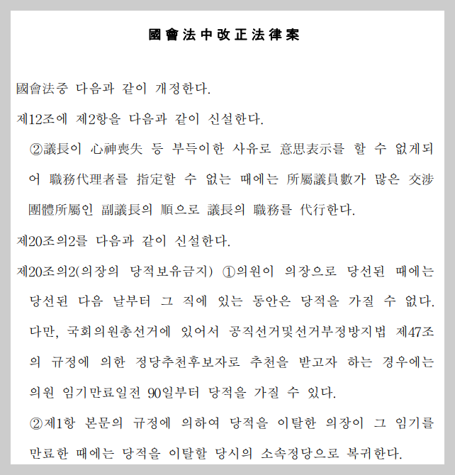 [국회법] 제20조의2(의장의 당적 보유 금지) ① 의원이 의장으로 당선된 때에는 당선된 다음 날부터 의장으로 재직하는 동안은 당적(黨籍)을 가질 수 없다.
