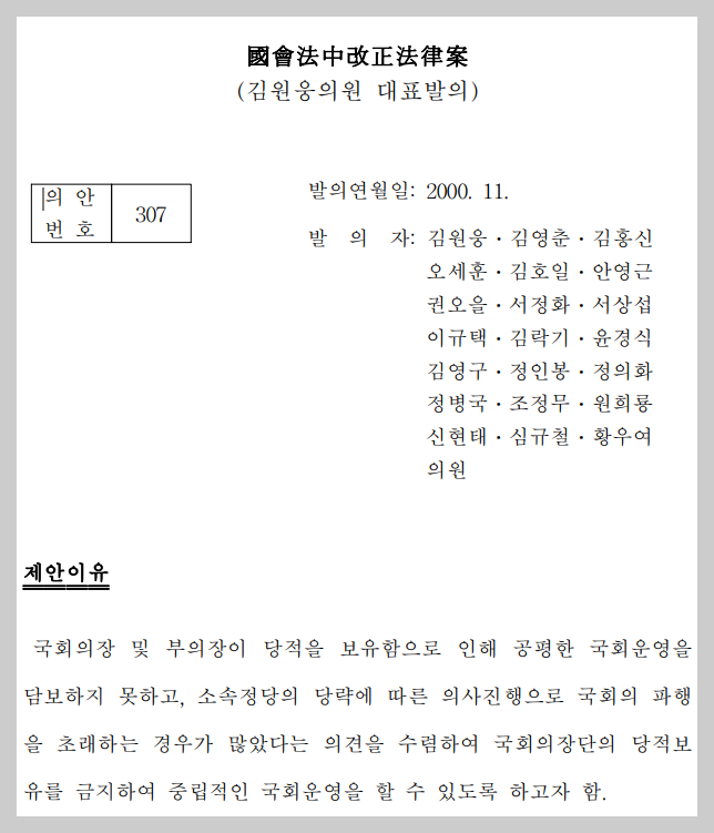 왜, 언제부터 국회의장은 탈당 및 중립의무가 강제되었을까? 결론부터 말하면 2002년 2월 28일 본회의에서 국회의장의 당적 보유를 금지하는 「국회법 개정안」이 통과되었다. 3월 7일부터 시행되었다. 당시 의장 당적보유 금지 「국회법 개정안」을 처음 대표발의(2000년 11.15일)한 의원은 김원웅이다.