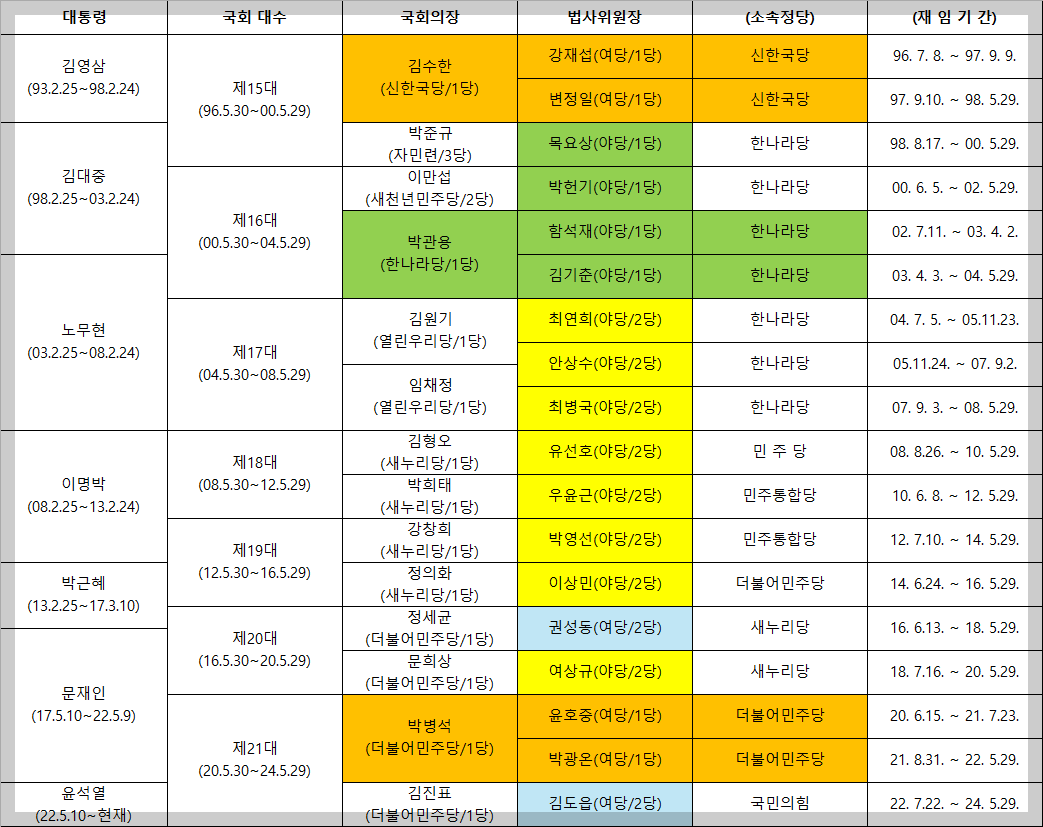 그렇지도 않다. 15대 국회 전반기, 16대 국회 후반기에는 국민의힘 계열인 신한국당·한나라당에서 의장과 법사위원장을 함께 맡았다. 반대로 21대 국회 전반기에는 민주당에서 국회의장과 법사위원장을 동시에 차지했다. 이것도 엄격하게 정해진 룰이 있다고 보기는 어렵다.