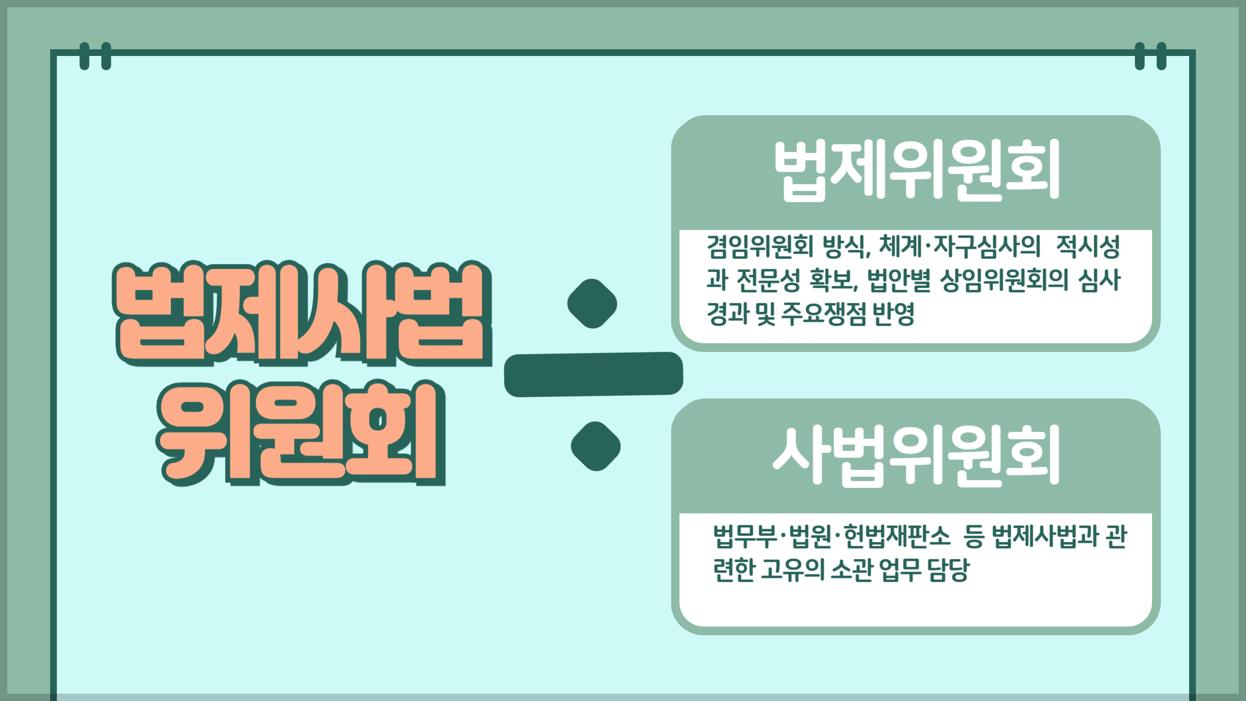 모든 법안은 법사위로 통한다. 현행 국회법은 상임위원회에서 법안 심사를 마치면 법사위의 체계·자구심사를 거쳐 본회의에 부의하도록 규정하고 있다. 법사위의 체계·자구심사가 '다른 상임위에 대한 월권'이라는 지적은 오래 전부터 계속되어 왔다. 법사위원이 반대하면 소관위원회 심사가 종료된 법안도 법사위에 장기계류 되는 문제가 빈번히 발생했다. 법사위의 과도한 권한남용. 아이러니 하지만 그게 민주당이나 국민의힘 모두 법사위를 사수해야 하는 이유가 되었다.
