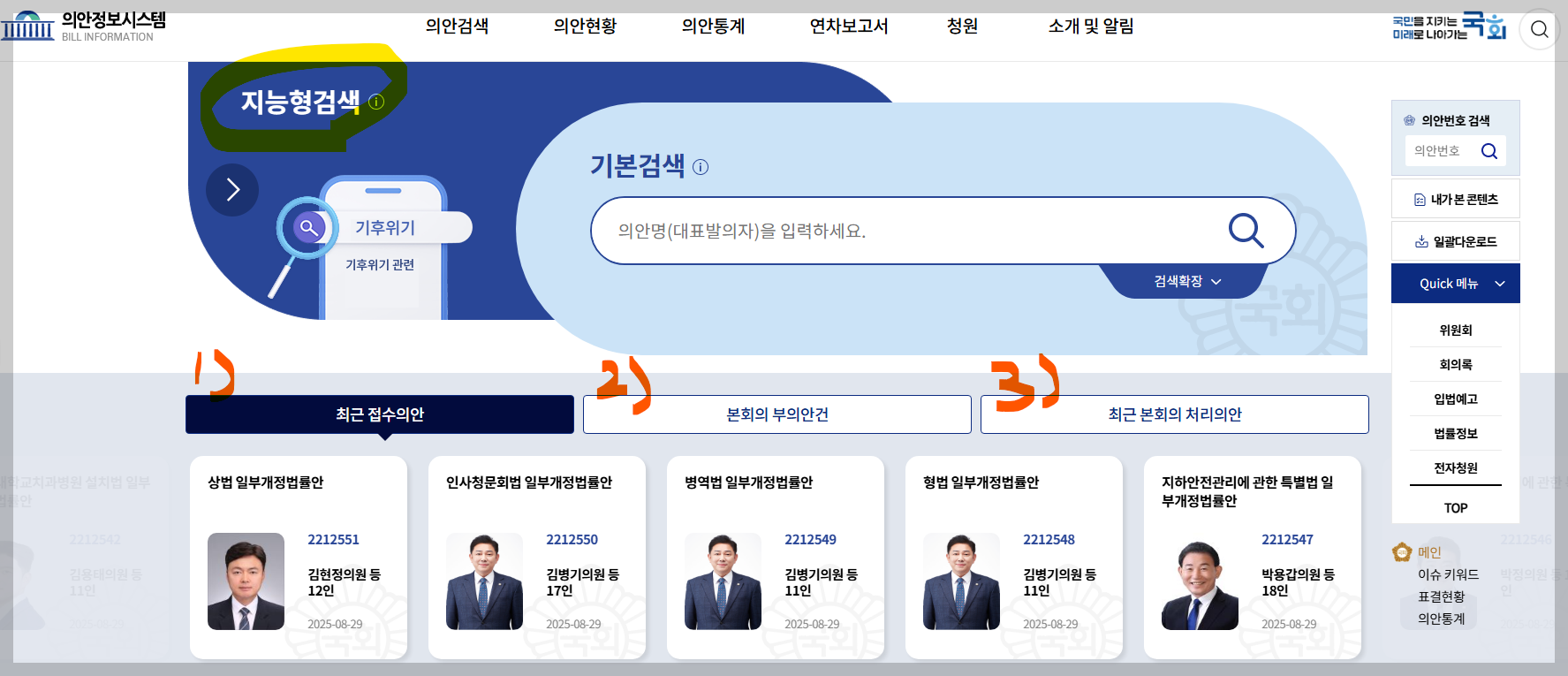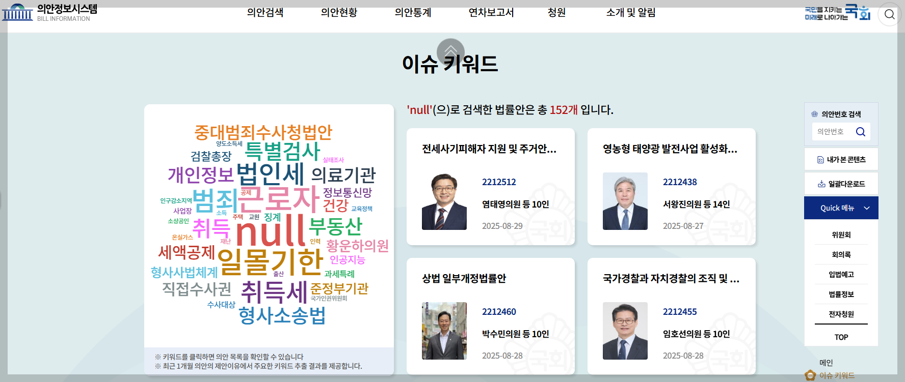 의안정보시스템의 첫화면은 메인, 이슈키워드, 표결현황, 의안통계 이상 4개의 카테고리로 구성됐다.