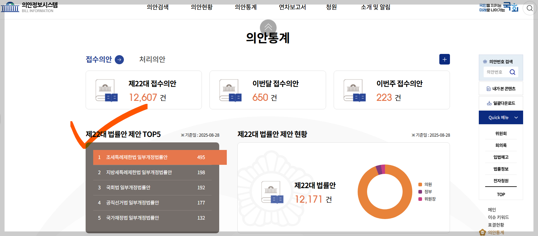 국회에 접수된 의안이 몇건이나 되는지를 전체, 한달, 일주일 기준으로 각각 카운팅해 보여주고 있다. 기왕 첫화면에 통계를 보여주려면 접수 의안 중 처리/미처리 의안 건수와 처리율을 보여줘야 한다. 법안처리율이 얼마나 낮은지 국회의원 본인은 물론 국민들도 항상 볼 수 있게 해줘야 한다.