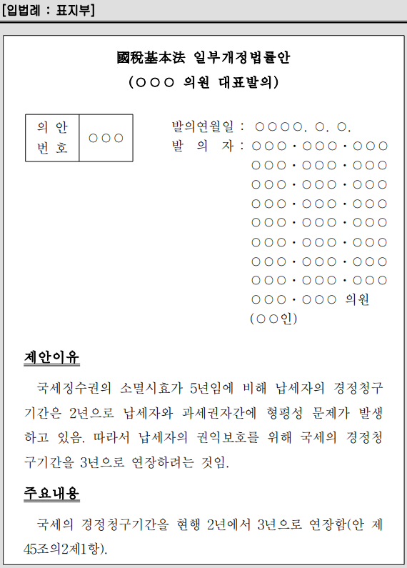 국회의원이 발의하는 개정 법률안의 형식은 표지부, 본문부, 신구조문대비표로 구성되어 있다. 표지부의 제안이유와 주요내용은 통상 <제안이유 및 주요내용>으로 함께 작성하기도 한다.