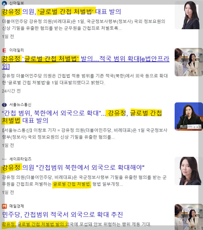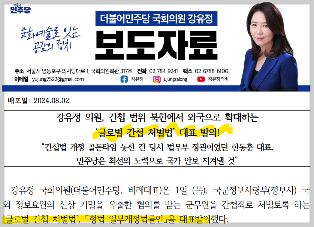 조금 과장을 보태 말한다면, 강유정 의원의 형법 개정안은 '법안'보다는 '보도자료'에 더 공을 많이 들인 것처럼 보인다. 특히, '글로벌 간첩 처벌법'이라는 자극적인 '신조어'를 만드는데 가장 많은 신경을 쓴 것 같다. 이번 기회에 국회의원의 보도자료를 여과없이 그대로 기사화하는 일부 언론의 관행도 되돌아볼 필요가 있다.