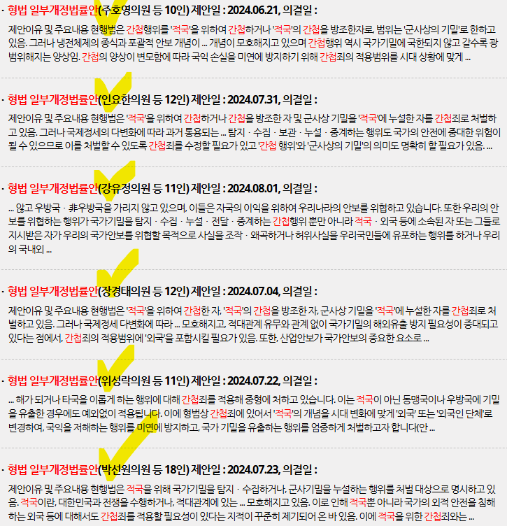| 6월 21일 | 주호영 | ⊙외국, 외국인, 외국인단체를 위하여 간첩한 자를 5년 이상의 징역에 처함 |