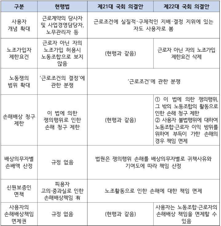 노란봉투법은 21대국회(2023년)와 22대국회(2024년) 본회의에서 두 번 의결되었다. 그러나 두 번 다 윤석열 전 대통령의 재의요구로 부결되었다. 현행법과 두 번의 본회의 의결안(최종 부결)을 비교해보면 아래 표와 같다.