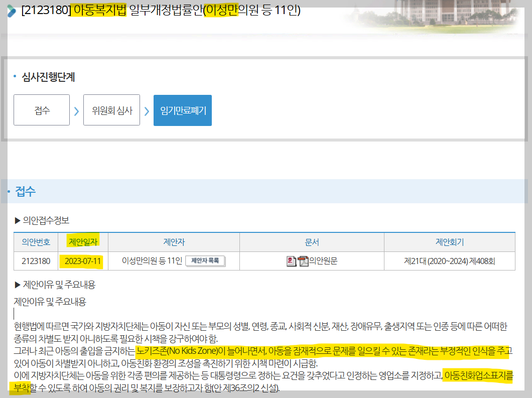 노키즈존은 음식점이나 카페 등에서 어린이의 출입을 금지하는 곳을 말한다. 반대의 개념으로는 YES키즈존, 키즈OK존 등의 표현이 있다. 노키즈존 운영에 대해서는 다양한 찬성 반대 입장이 있다. 현행법 상 아동이 성별, 연령 등에 따른 어떠한 종류의 차별도 받지 않도록 해야하고, 이와 관련하여 국가인원위원회도 식당 이용대상에서 아동을 배제하지 않도록 권고한 바 있다. 그러나 노키즈존 운영에 대해 처벌할 수 있는 법률은 없다. 이런 상황에서 노키즈존을 아동학대로 규정하는 법안이 발의되었다. 찬반 논란이 예상된다.