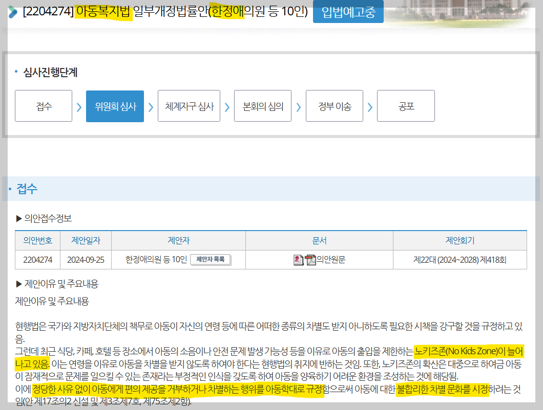 한정애 의원은 노키즈존을 아동학대로 규정하는 「아동복지법」 개정안을 발의했다. 아동복지법 제3조(정의)에서 '정당한 사유 없이 아동에 대하여 편의 제공을 거부하거나 차별하는 것'을 아동학대에 포함시키고, 동 법률 제17조의2(재화ㆍ용역 등의 제공에 있어서 아동 차별 금지)를 신설했는데, 그 내용은 '재화ㆍ용역 등의 제공자는 정당한 이유 없이 아동을 해당 재화ㆍ용역 등의 이용에서 배제하여서는 아니 된다.'는 것이다.