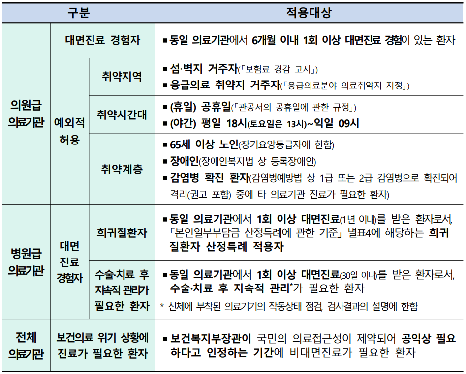 한시적 비대면진료에서는 대상환자에 제한이 없었지만, 시범사업에서는 비대면진료가 가능한 환자를 제한했다. 의료기관별 대상환자는 위 <표>와 같다.