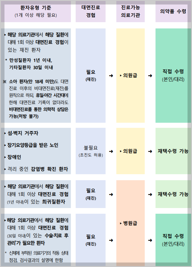 비대면진료 시범사업에서 환자별 진료가능 의료기관과 의약품 수령 방법은 위 <그림>과 같다. 의약품 수령 방법은 닥터나우 플랫폼 논쟁에 대한 이해를 위해 잘 기억해 둘 필요가 있다.
