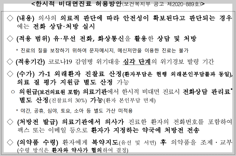 코로나 확산으로 감염병 위기단계가 ‘심각’으로 상향(‘20.2.23)되면서 정부는 전화상담 또는 처방을 일시적으로 허용했다. 이후 환자·의료인 감염 예방을 위해 원격진료 필요성이 높아졌고, 2020년 12월 15일, 「감염병의 예방 및 관리에 관한 법률」을 개정하여 '비대면 진료'를 허용했다. 다만, '한시적'이라는 꼬리표를 달았다. 감염병 위기 경보 '심각단계' 이상에서만 적용할 수 있도록 한 것이다.