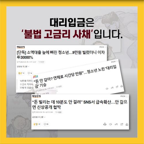 여성가족부의 '2022년 청소년 유해환경 실태조사'에 따르면 중고등학생의 3.4%가 대리입금을 이용한 적이 있다고 응답했다. 상당히 심각한 문제인데, 이런 청소년 대상 고금리 소액 대부업은 최근에 생긴 수법이 아니다. 이미 2019년 3월, 조선일보는 고등학생이 게임 아이템 구입을 위해 수고비(이자) 30%, 지각비(연체료) 2시간 당 1천원 조건(연 5,000% 상당)으로 SNS상 8만원을 빌린 사례를 소개하며 이런 문제의 심각성을 제기하였다.