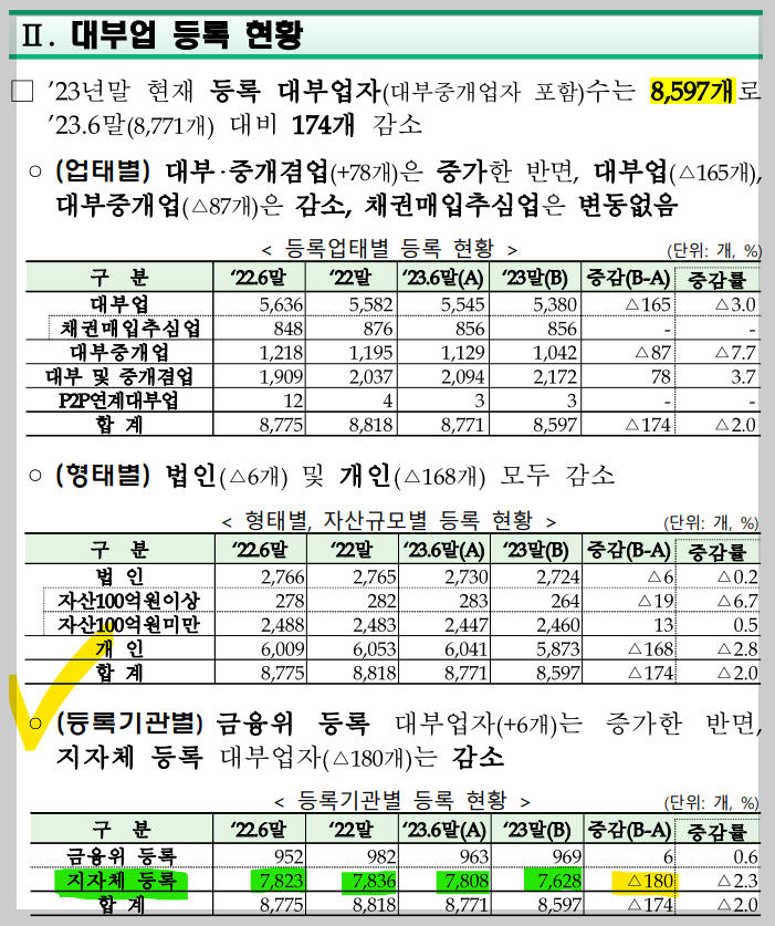 금융감독원 자료에 따르면 2023년 말 현재 등록 대부업자는 8,597개다. 이 중 지자체 등록업자가 7,628개로 전체 대부업자의 89%에 이르고 있다.