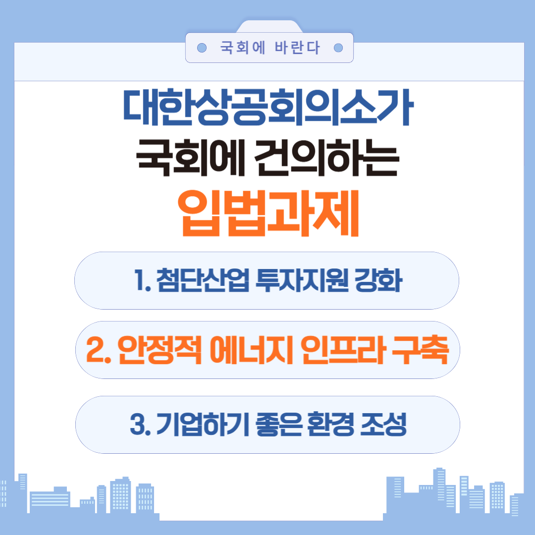 | 대한상의 국회 건의 입법과제_(1)첨단산업 투자지원 법안 (2) | 2024.10.23 |