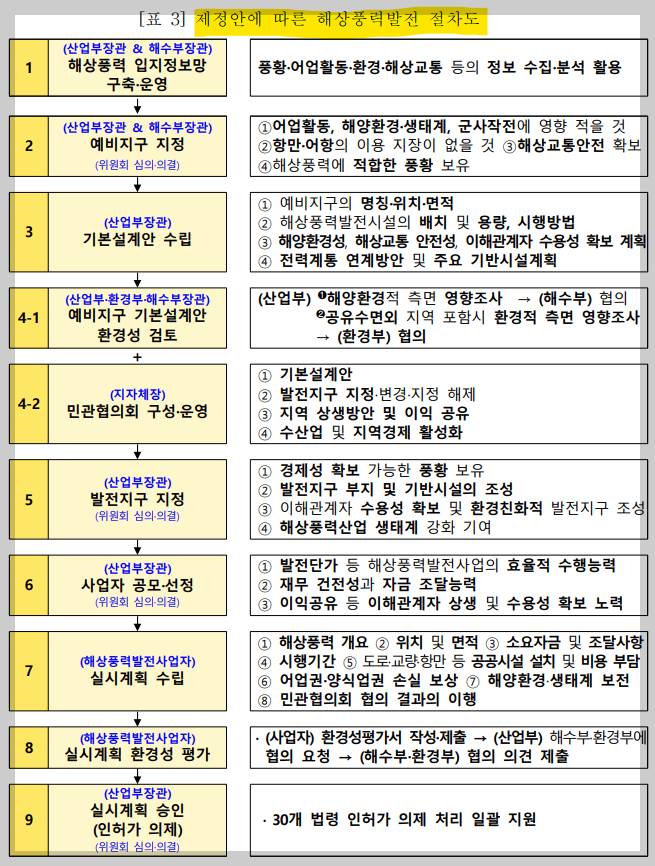 이러한 상황에서 발의된 '해상풍력 특별법안'은 정부 주도로 해상풍력발전 입지를 발굴하고, 발굴된 입지에 대해서 민관협의회를 통해 주민수용성을 확보하며, 환경성·주민수용성이 확보된 발전지구에 대해 정부가 각종 협의 및 인‧허가를 일괄처리함으로써 해상풍력발전의 전 과정을 지원하는 내용이 담겨있다.