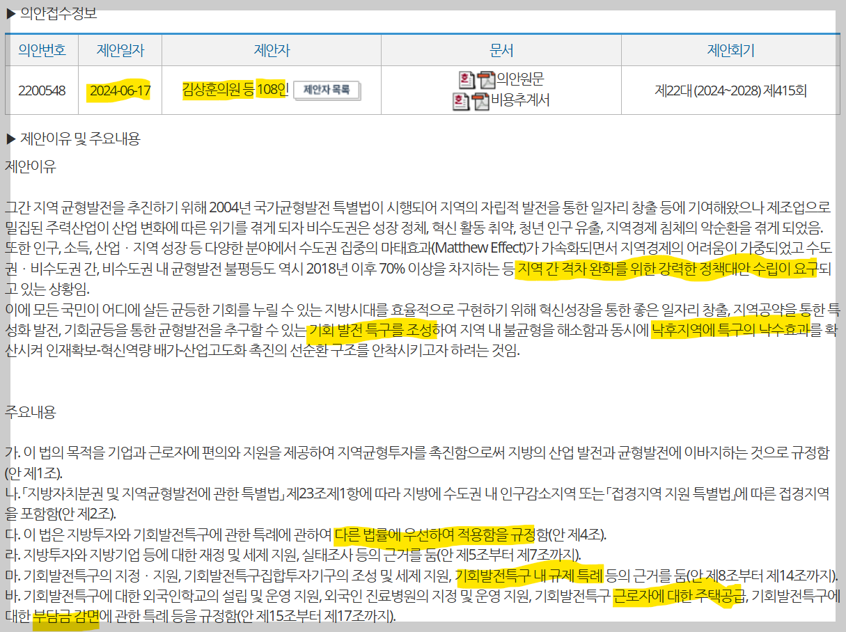 당론이라고 하는 이유는 국민의힘 의원 108명 전원이 공동으로 발의했기 때문이다. 반면 정진욱(안)은 「지방투자촉진 특별법안」으로 제목은 다르지만 내용은 유사하다. 기회발전특구에 특례를 부여하고 특구 근로자에 대한 주택 특별공급, 개발 부담금 감면 규정 등을 담고 있다. 정진욱 의원 등 25명의 의원이 발의에 참여했다. 참고로, 지난 6월에 경북·전남·전북·대구·대전·경남·부산·제주가 기회발전특구로 지정되었으나 현재 기회발전특구의 인센티브 제공에 대한 법적 근거가 미비하여 이 특별법 제정안이 통과될 필요가 있다.