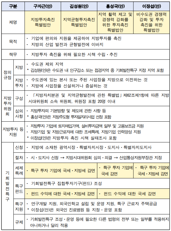 | 의안명 | 지방투자촉진 특별법안 | 지역균형투자촉진 특별법안 | 지역 활력 제고 및 경쟁력 강화를 위한 투자촉진 특별법안 | 비수도권 경쟁력 강화 및 투자 촉진을 위한 특별법안 |