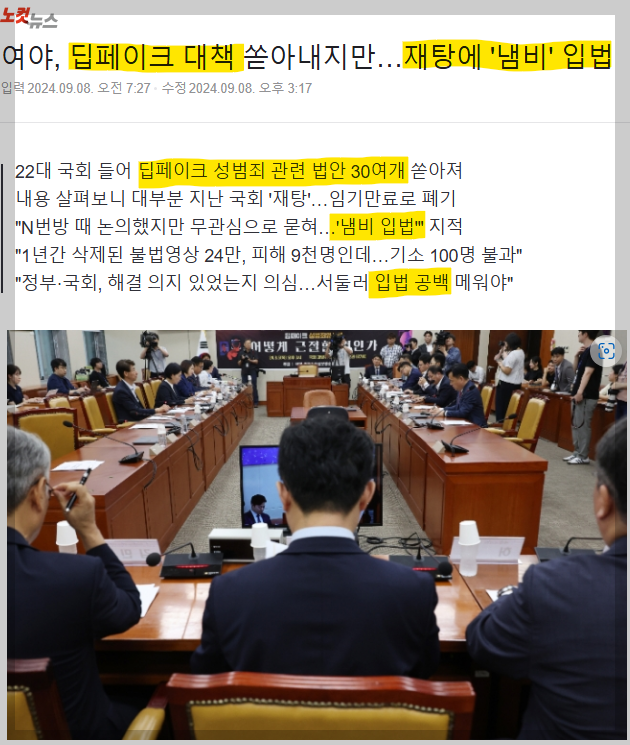지난 8월 26일, 딥페이크 성범죄가 전방위적으로 확산되고 있다는 보도 이후 관련 법안 41건이 발의되었다. 노컷뉴스의 "여야, 딥페이크 대책 쏟아내지만…재탕에 '냄비' 입법"이라는 제목의 분석기사가 눈에 띈다. 관련 법안의 대부분이 재탕이고, 냄비입법임을 지적하면서, 실효성 있는 대책을 주문하고 있는 기사다. '국회의 입법'에 대해 제대로 된 방향에서 분석하는 좋은 기사라고 생각한다.