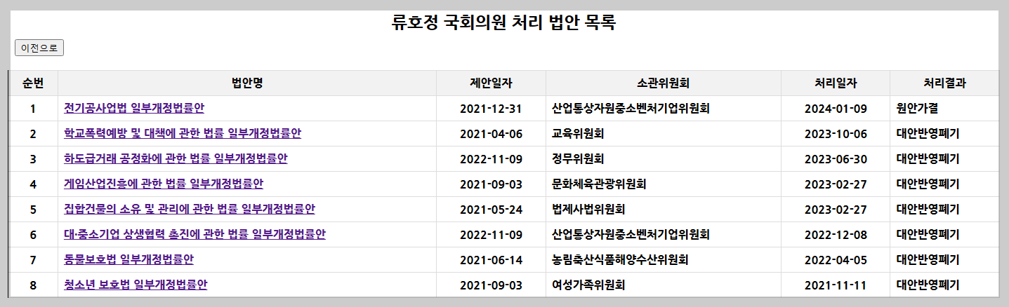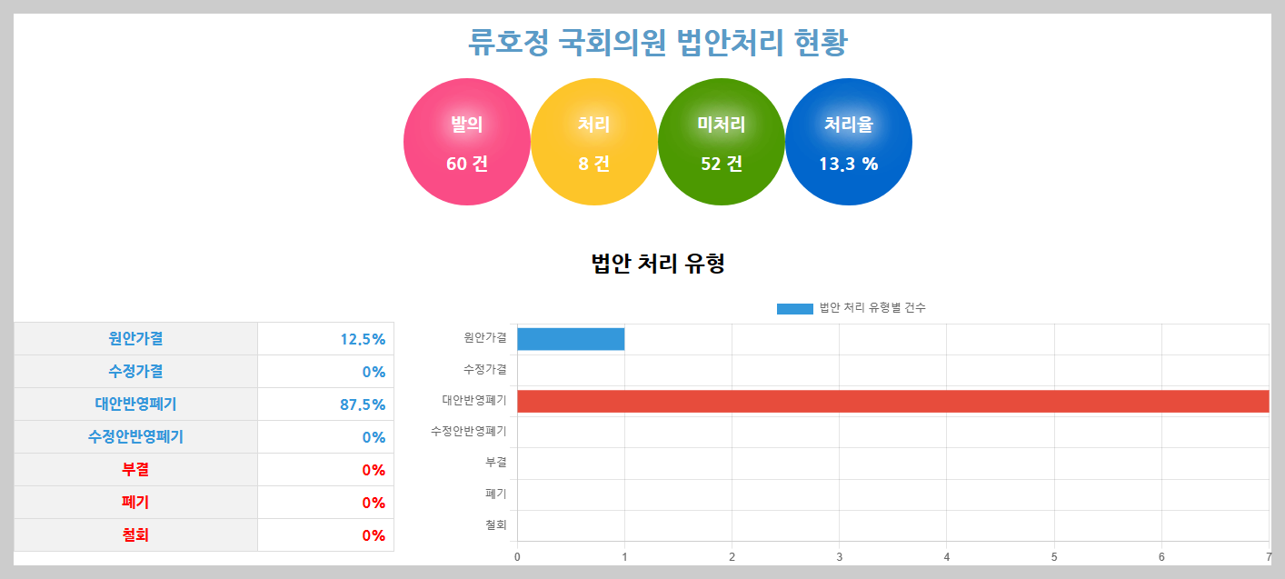류호정 의원의 21대 국회 법안 발의 건수는 60건이다. 처리 법안은 8건으로 처리율은 13.3%다. 미처리법안 52건은 현재 국회일정을 감안할 때 국회의원 임기만료와 함께 폐기가 될 가능성이 크다.