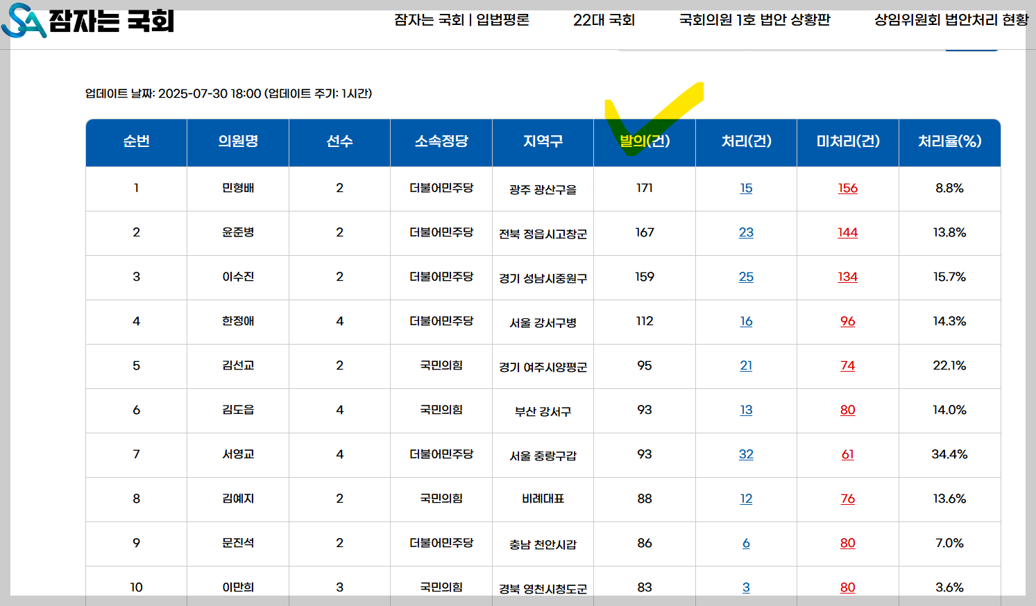 <잠자는국회>에서는 국회의원의 법안 발의 건수, 처리율, 미처리 건수 등을 기준으로 1위부터 최하위까지 소팅이 가능하다. 2025년 7월 30일 현재 기준으로 <잠자는국회>에서 발의 건수와 처리율 기준으로 소팅한 Top 10은 아래와 같다.