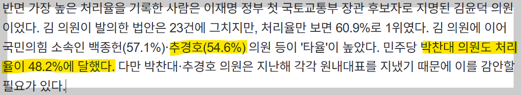대체적으로 틀린 데이터가 없는데, 박찬대 의원과 추경호 의원의 법안 처리율에는 오류가 있어보인다. 기사에서 박찬대의 처리율이 48.2%라고 했는데, 법률안 기준으로 보면 박찬대 의원은 12건의 법안을 대표발의 했고 이중 본회의까지 통과된 법안은 한건도 없다.