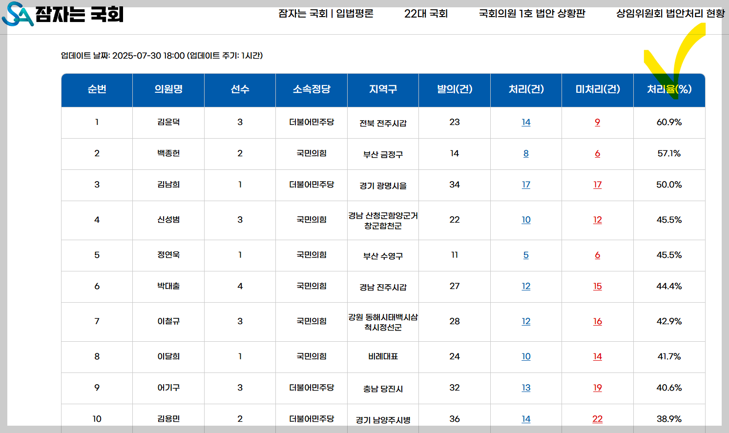 <잠자는국회>에서는 국회의원의 법안 발의 건수, 처리율, 미처리 건수 등을 기준으로 1위부터 최하위까지 소팅이 가능하다. 2025년 7월 30일 현재 기준으로 <잠자는국회>에서 발의 건수와 처리율 기준으로 소팅한 Top 10은 아래와 같다.