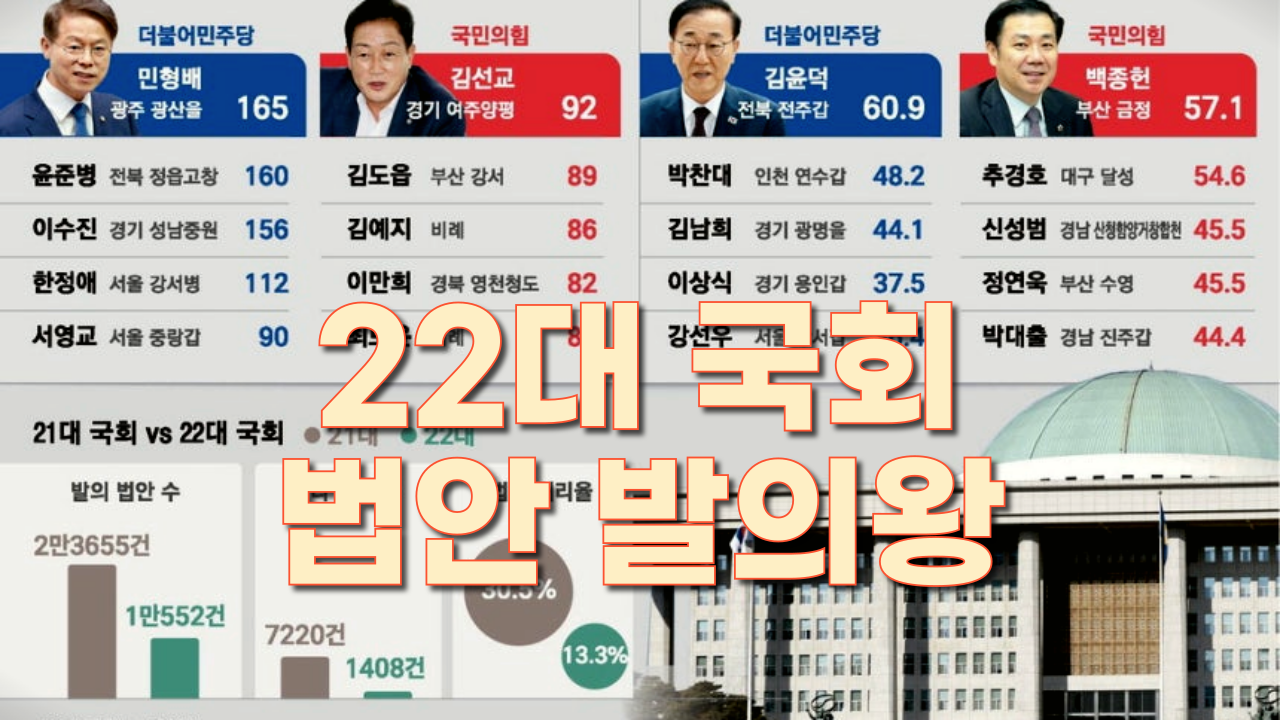 22대국회 1년 평가, 법안발의 野선 김선교·김도읍·김예지順 민주당 김윤덕·국힘 백종헌 10건 중 6건꼴 통과시켜 '톱' 국힘보다 발의 많았던 민주 법안 처리율은 오히려 뒤져 22대 국회가 의정활