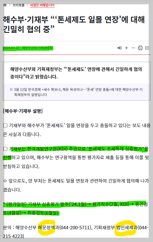 지난 3월, 기재부와 해수부가 공동으로 밝힌 입장에 의하면, 현재 톤세제 연장여부 결정을 위한 평가(일종의 용역으로 추정)가 진행 중이고, 최종 검토는 6월 말에 끝날 것으로 보인다. 이 평가 결과에 따라 연장여부가 결정될 것으로 보인다.