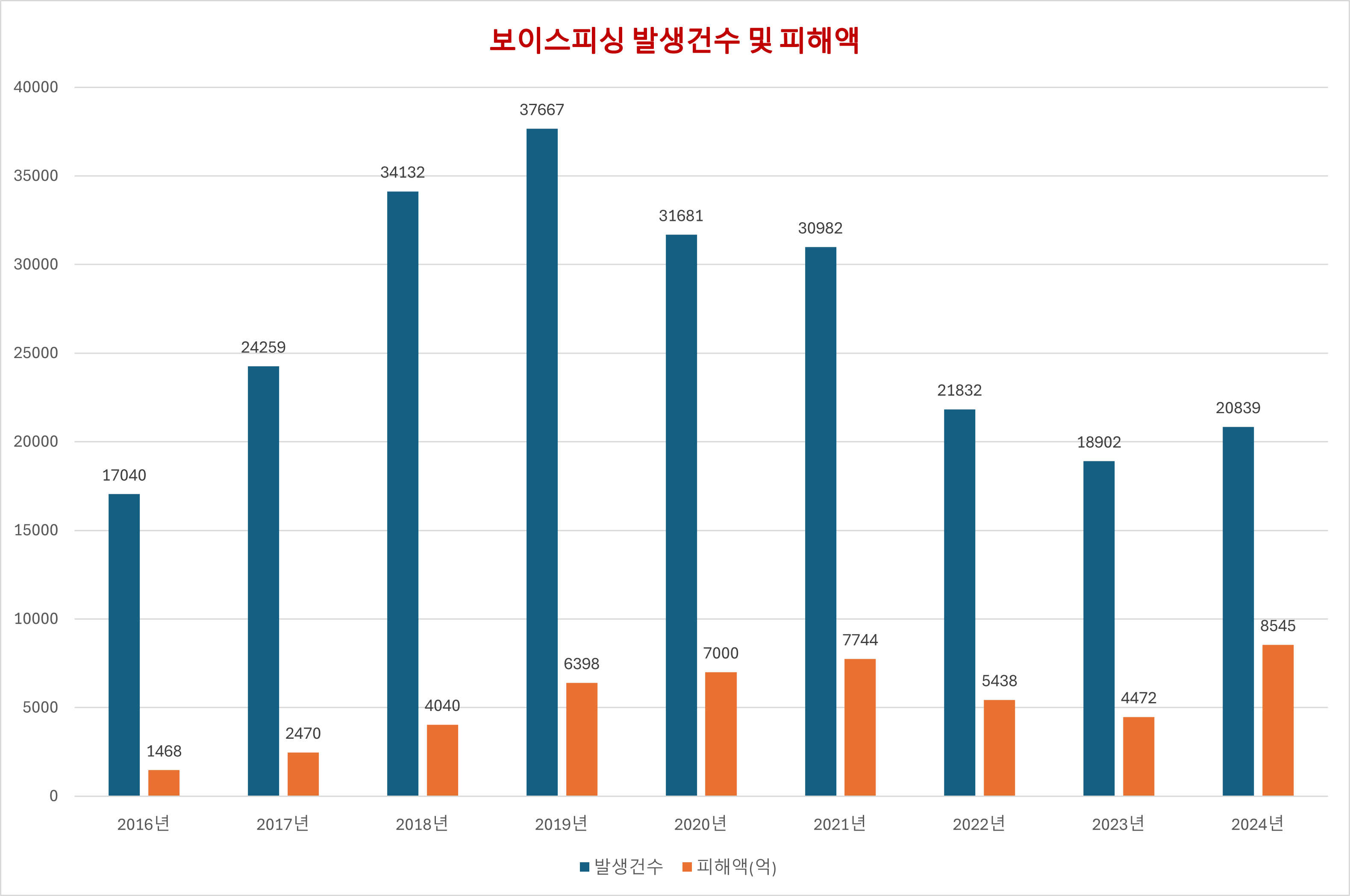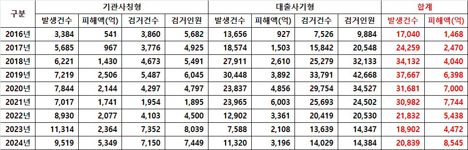 2024년 보이스피싱 발생 건수는 20,839건에 피해액은 8,545억원이다. 금년 2025년 상반기 보이스피싱 발생 건수는 1만 2000여건으로 전년 동기 대비 23% 증가했다.