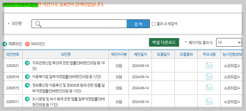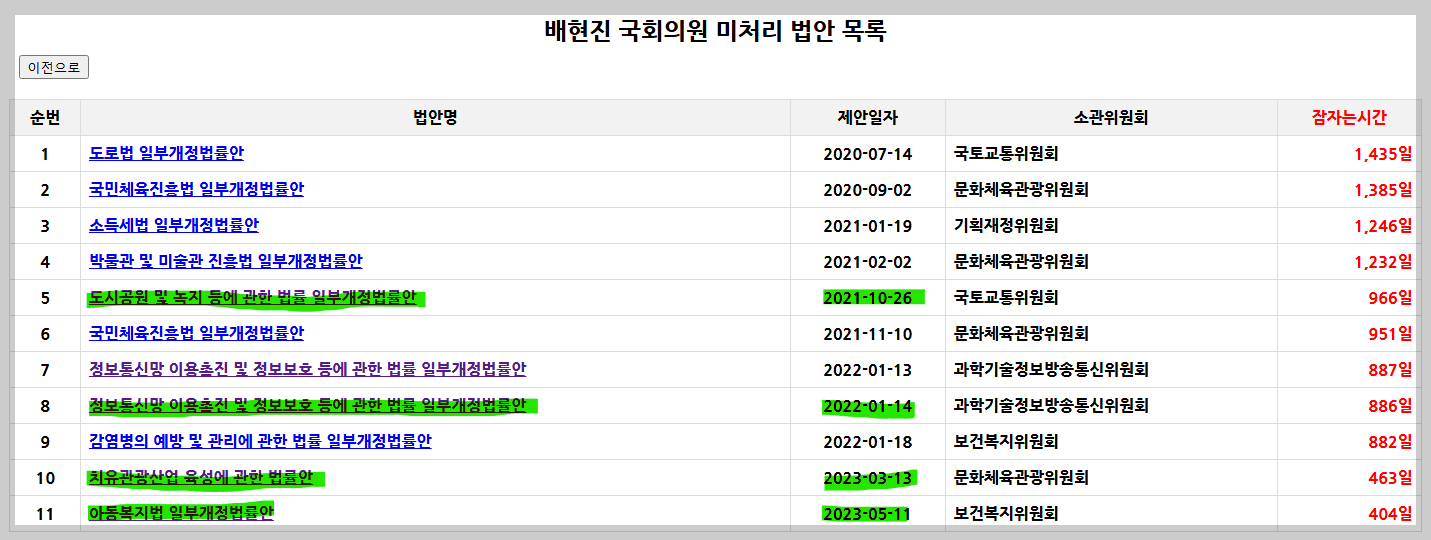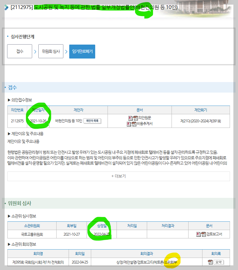 쉽게 말하면, 일단 돈이 너무 많이 들고, 또한 어린이공원 의무설치 보다는 지금처럼 지자체가 위험한 곳에 먼저 설치하도록 하는 것이 타당하다는 의견이다. 보통 필요성, 실현가능성, 시급성이 크지 않은 법안은 소위에 계류된 상태로 더 이상 진행되지 않는 경우가 많다. 배현진 의원의 이 법안도 그렇게 분류되었을 가능성이 크다. 그런데 똑같은 법안을 22대국회에서 다시 발의한 것이다. 그럼 나머지 법안들은 21대 국회에서 어떠했을까?