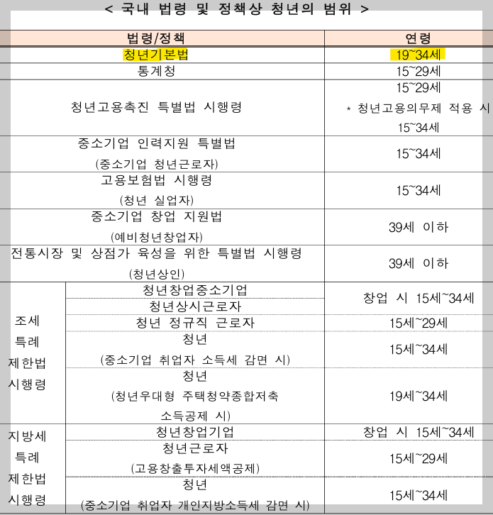 | 15세 이상 29세 이하 | 15세~34세 | 19세~39세 |