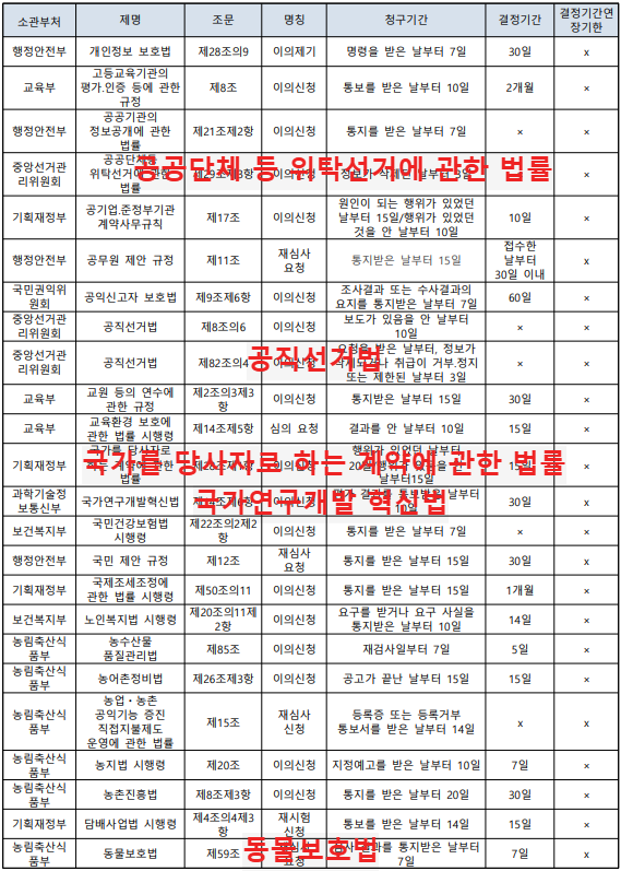 아래 <그림>은 이 용역보고서의 내용 중 일부다. 개별 법령 중에서 '행정기본법이 정한 청구기간보다 짧은 기간을 청구기간으로 규정한 법령'을 정리한 것이다. 이런 불일치 사례에 대해 개별법령의 기간을 조정해서 「행정기본법」과 맞추는게 법령정비 사업의 목적이다.