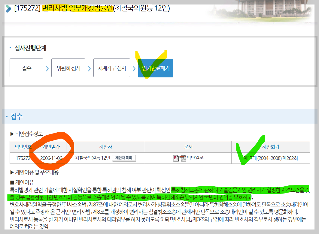 17대 국회부터 21대까지 5번 도전해서 5번 실패한 법안이 있다. 17대라고 하면 감이 잘 안올텐데, 2006년 11월 6일에 최철국 의원이 발의한 변리사법 개정안이 출발점이었다. 17대, 18대에서는 소관 상임위인 산업자원위원회를 통과했으나, 법사위 문턱을 넘지 못해 폐기되었다.