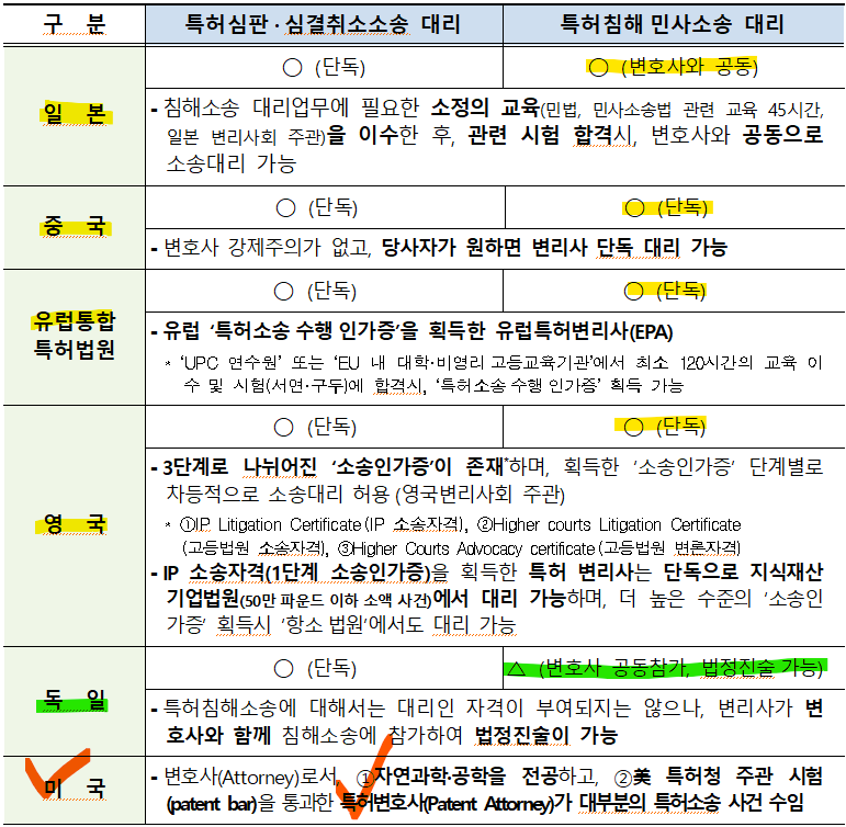 위 표에 대한 특별한 설명은 필요없어 보인다. 우리나라 변호사들의 '온갖 반대 논리'와는 달리 해외 주요국들은 변리사의 소송대리를 적극적으로 허용하고 있다.
