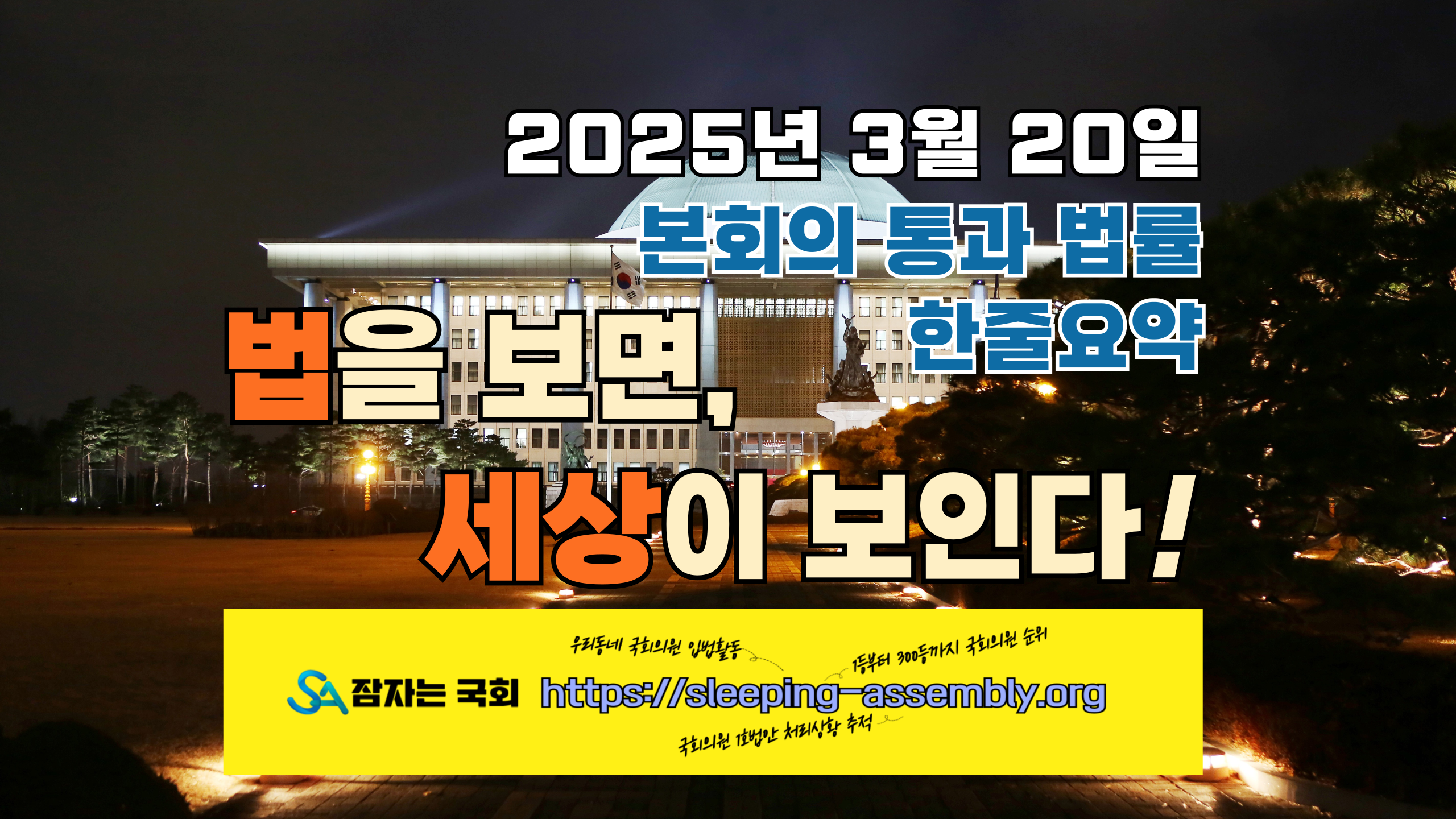 이 외에 2025년 3월 20일에 본회의를 통과한 법률을 살펴본다. 통과된 법안의 정확하고 구체적인 내용은 법률 이름에 링크해 놓은 국회 의안정보시스템에서 확인할 것을 권장한다.