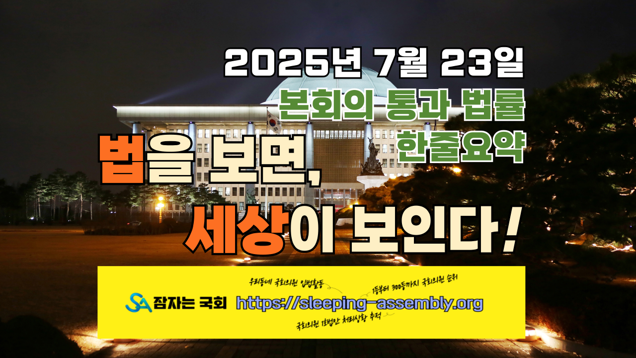 2025년 7월 23일, 국회는 본회의를 열어 비쟁점법안 20건을 의결했다. 본회의에서 처리한 제개정 법률을 간략히 소개한다. 정확한 내용은 법률 제목에 링크한 국회의안정보시스템에서 확인할 것을 권장한다.