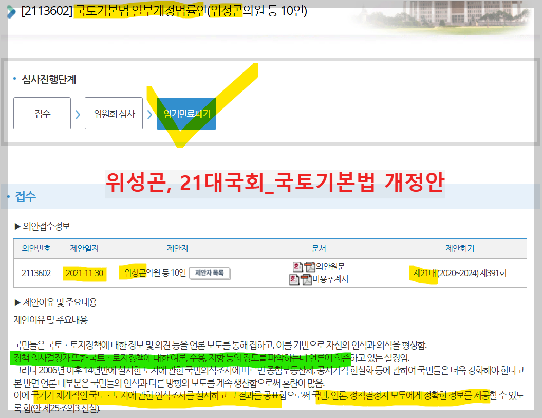 3년 주기로 국토·토지 국민인식조사를 정례화하자는 이 법안은 국토위 소위에 회부되었으나, 제대로된 논의 한번 하지 못하고 21대국회 임기만료로 폐기되었다. 폐기된 이유는 이 법안에 대한 국토부 입장 때문으로 보인다.